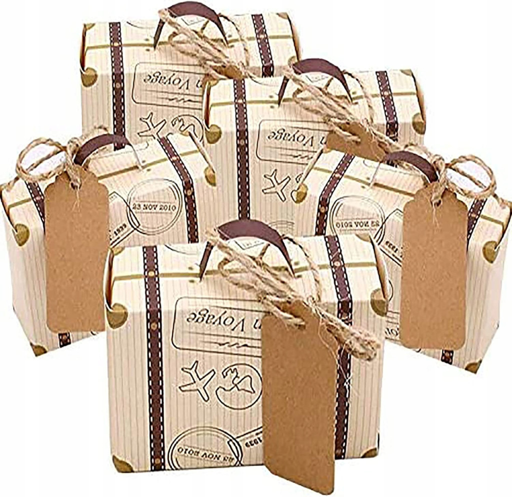 Do pudełka pudełkowego mającego konstrukcję w obudowie mini walizki. Jego klasyczny wygląd sprawia, że nadaje się na imprezy podróżnicze, rodziny, baby shower i różne okazje.