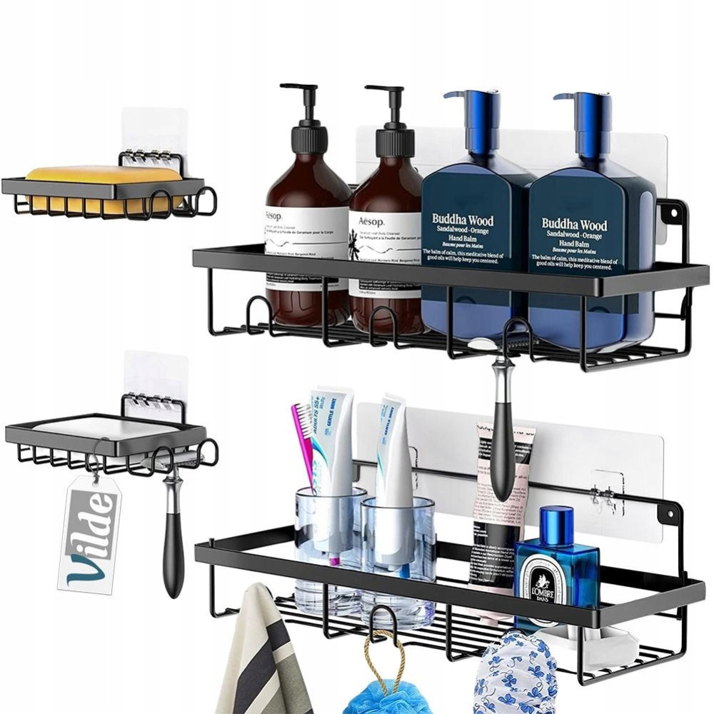 Zestaw czterech półek pod prysznic w dwóch rozmiarach, idealne na kosmetyki i akcesoria łazienkowe. Wykonane z wytrzymałych materiałów. Półki utrzymane w industrialnym stylu typu loft, doskonale wpasują się w każde wnętrze łazienki. Łatwy montaż i praktyczne przechowywanie kosmetyków sprawią, że będą one bardzo praktycznym elementem wyposażenia łazienki. Oryginalny produkt marki Vilde. Wyprodukowano zgodnie z europejskimi standardami.