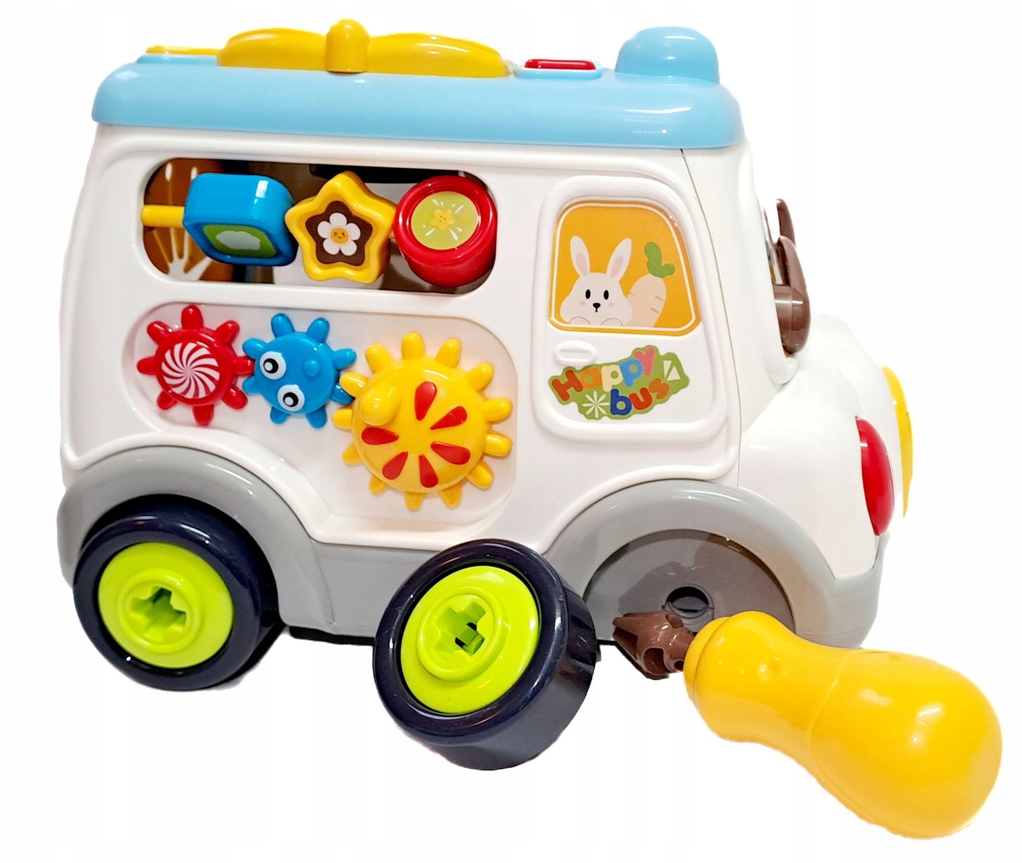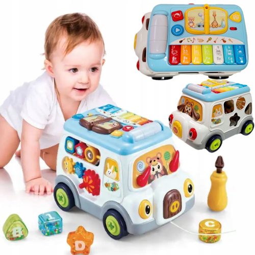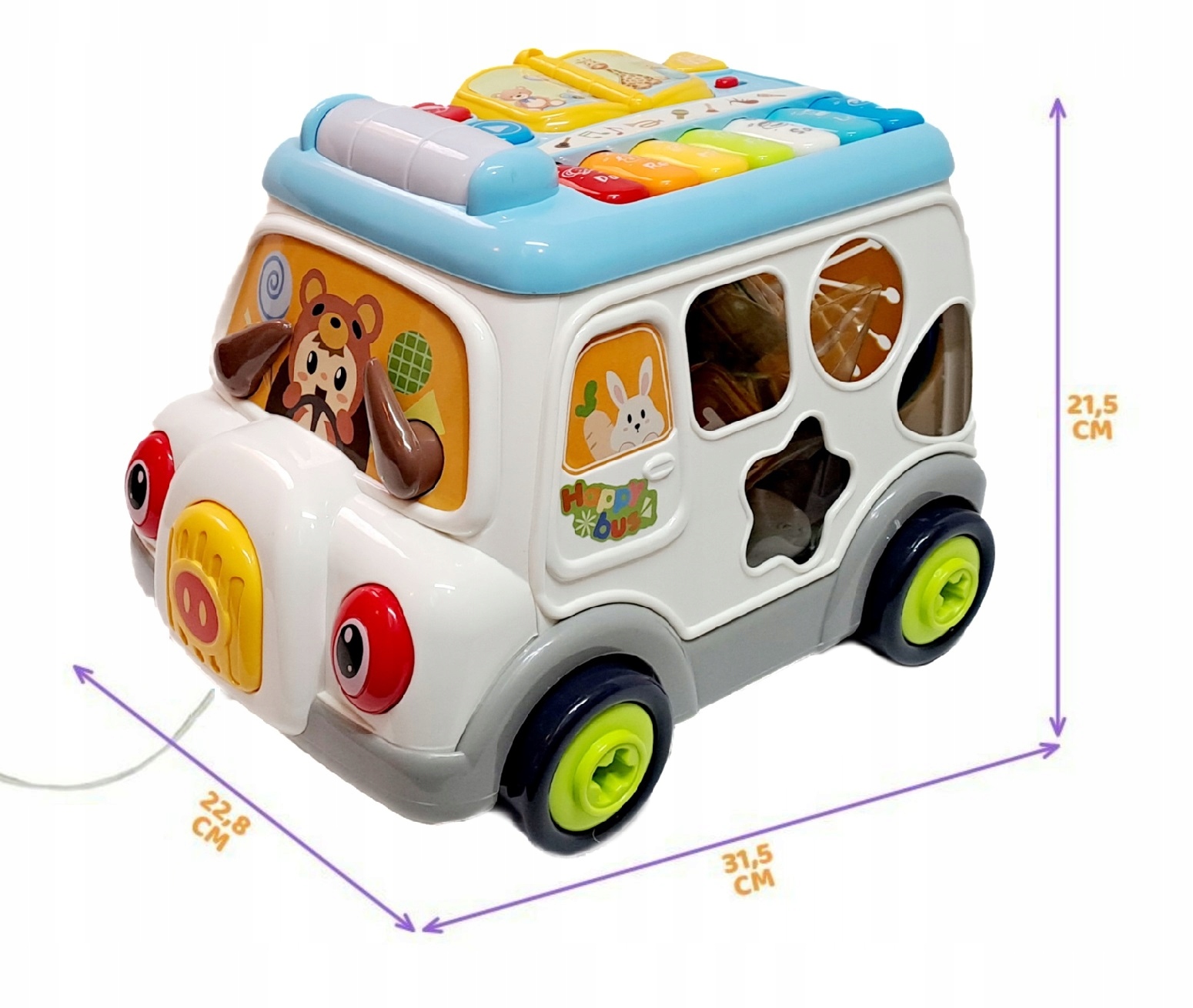 Interaktywny Autobus Szkolny na swoim dachu ma książeczkę, znajdują się tam też przyciski, oraz pianinko, po naciśnięciu jego klawiszy odgrywane są dźwięki