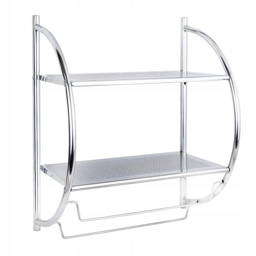 Stylowa półka z chromowanego metalu, z którego została wykonana zapewnia trwałość oraz estetyczny wygląd. Mocowana jest do ściany za pomocą kołków montażowych. Prócz dwóch półek posiada dodatkowe ramiona do zawieszenia np. ręczników.