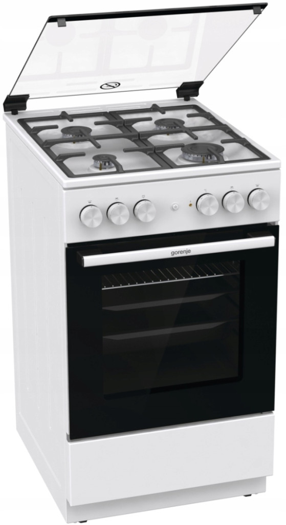 Kuchnia gazowo-elektryczna Gorenje GK5A41WF w kolorze białym. Szerokość 50 cm, pojemność piekarnika 62 l, czyszczenie parowe AquaClean.