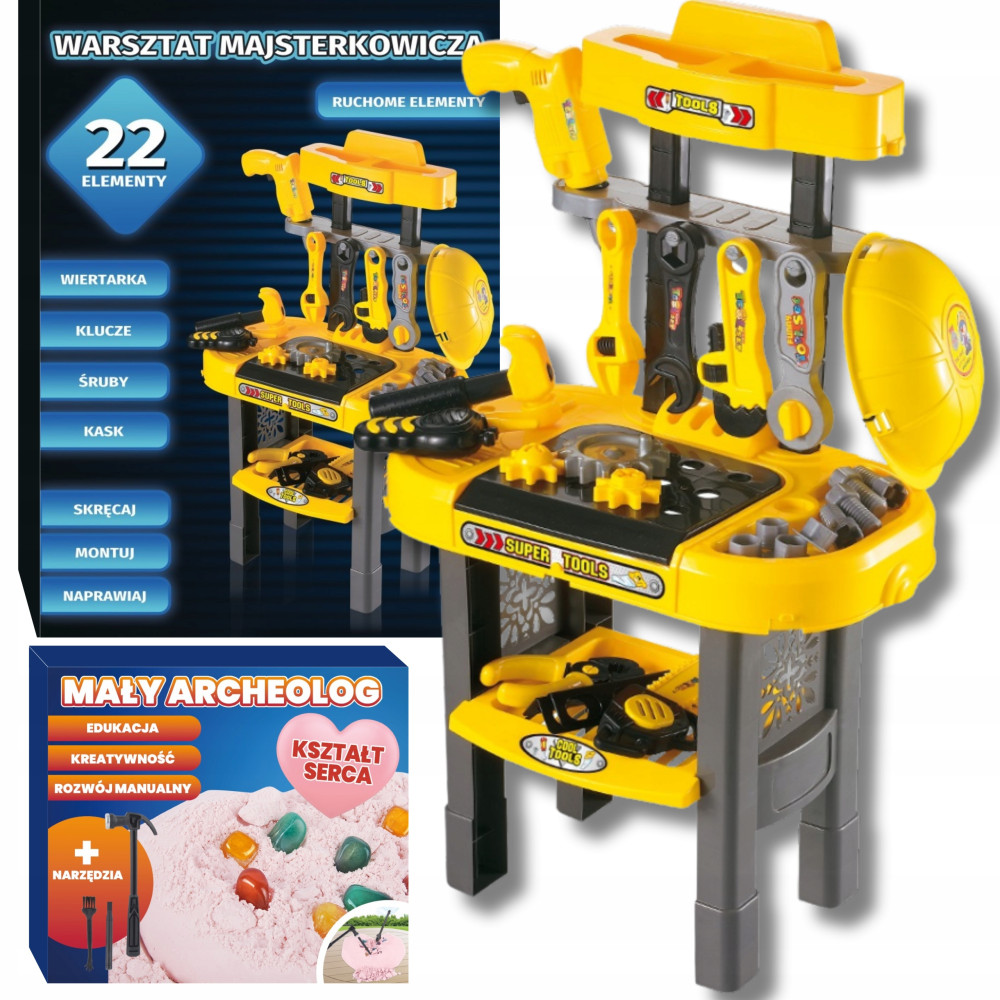 Nasze unikalne narzędzia warsztatowe dla dzieci obejmują stół warsztatowy śrubki, nakrętki, kask, wiertarka, kombinerki, 2 klucze, mini piła, kątownik.