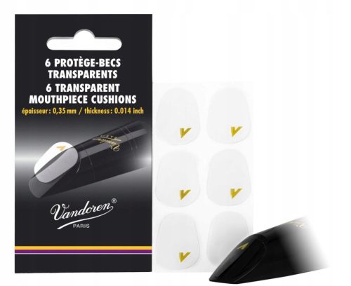 Naklejki na ustnik firmy Vandoren przeznaczone do klarnetów i saksofonów, przeciwdziałają uszkodzeniu ustnika zębami podczas gry oraz zapobiegają wibracjom pomiędzy ustnikiem, a zębami. Specjalna formuła pozwala na kilkakrotne przyczepianie i usuwanie naklejek, nie pozostawiając lepkich śladów kleju.