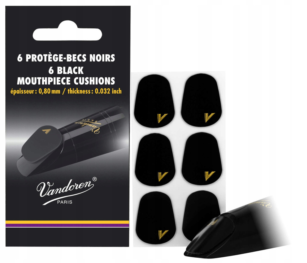 Naklejki na ustnik firmy Vandoren przeznaczone do klarnetów i saksofonów, przeciwdziałają uszkodzeniu ustnika zębami podczas gry oraz zapobiegają wibracjom pomiędzy ustnikiem, a zębami. Specjalna formuła pozwala na kilkakrotne przyczepianie i usuwanie naklejek, nie pozostawiając lepkich śladów kleju. Opakowanie zawiera 6 sztuk naklejek.