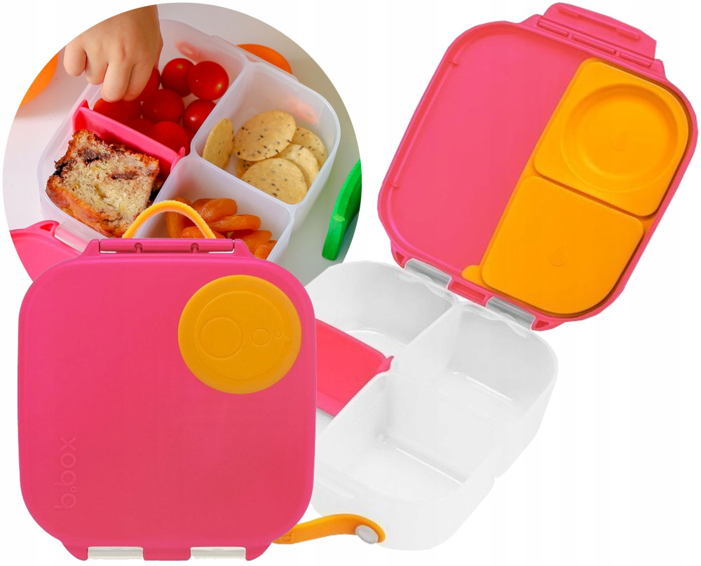 Mini lunchbox b.box dla dzieci ma dwie szczelne przegródki w tym jedną flex przeznaczoną na całe owoce. W przegrody te można włożyć także takie przekąski jak jogurt, humus, gęsty przecier, dip, soczyste owoce i warzywa. Obok znajduje się przegroda bez uszczelki z przesuwanym i wyjmowanym elementem dzielącym ułatwiającym dopasowanie do potrzeb. Lunchbox b.box ma kształt poręcznej walizeczki w wygodnym uchwytem i prostym w obsłudze zatrzaskiem.