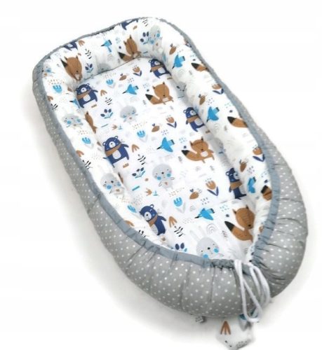Kokon jest wypełniony antyalergiczną kulką silikonową, spód kokonu wypełniony jest antyalergiczną mięciutką owatą silikonową. Całość uszyta jest ze 100% bawełny, sznurki do wiązania również są bawełniane.
