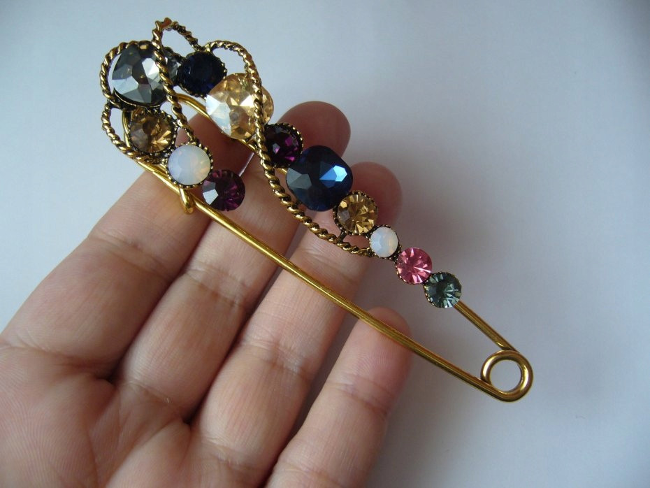 BROSZKA AGRAFKA WYKONANA Z METALU W KOLORZE STAREGO ZŁOTA, ZDOBIONA SZKLANYMI CYRKONIAMI
