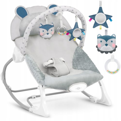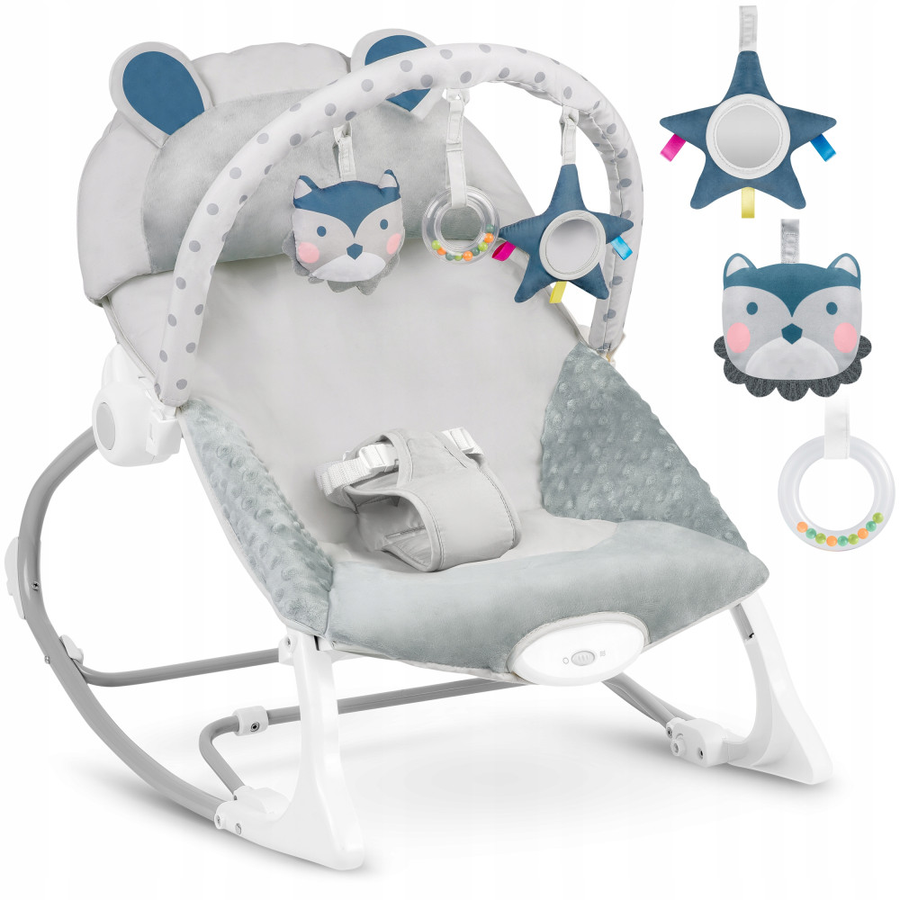 Leżaczek został wyposażony w zdejmowany pałąk z przyczepionymi szeleszczącymi zabawkami - sówką i wilczkiem oraz grzechotką. Zapewnią one Twojemu dziecku rozrywkę, podczas gdy Ty będziesz mógł odpocząć. Te wyjątkowe zabawki stymulują wzrok oraz rozwijają zmysł dotyku.