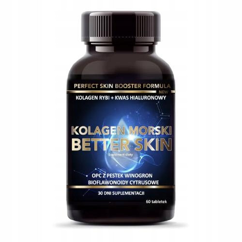 Suplement diety Kolagen morski Better skin to preparat w postaci tabletek zawierający ekstrakt z pestek winogron, hydrolizat kolagenu rybiego, kwas L-askorbinowy, glukonian cynku, kwas hialuronowy i ekstrakt z gorzkiej pomarańczy. Składniki suplementu diety wspomagają utrzymywanie dobrej kondycji skóry, a także korzystnie wpływają na zdrowie i jej wygląd. Wspierają prawidłową produkcję kolgenu i wzmacniają naczynia krwionośne. Przez obecność kolagenu rybiego produkt cechuje się lepszą rozpuszczalnością.