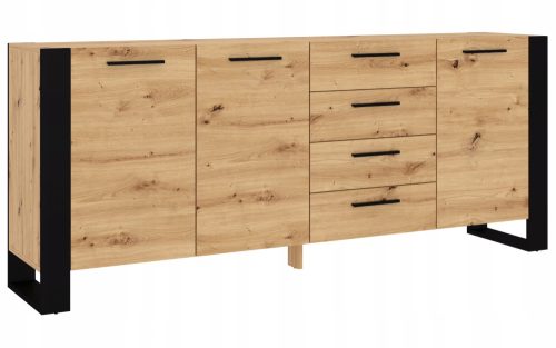 Niezwykle elegancka i stylowa komoda do salonu lub sypialni wykonana w modnej i naturalnej kolorystyce. Charakteryzuje się nowoczesnym i przyjemnym dla oka wyglądem - o jej uroku decydują duże czarne nogi w formie ramy, które pięknie kontrastują z resztą mebla. Szafka posiada dwie zamykane przestrzenie, za którymi znajdują się półki. W komodzie znajdują się również cztery szuflady.