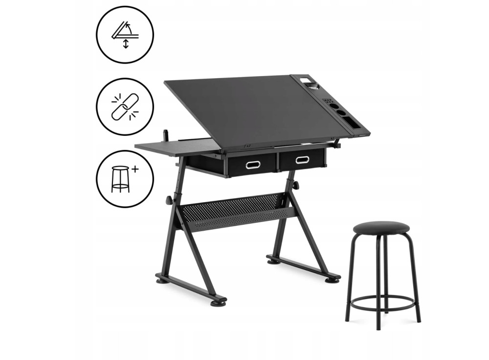 Stół o wymiarach 115 x 60 cm i regulowanej wysokości (65-90,5 cm) posiada blat o grubości 15 mm. Wykonano go z mocnej płyty MDF oraz wyposażono w elementy z PVC. Ramę zrobiono ze stalowych rurek pomalowanych proszkowo. W konstrukcji zastosowano również nylonową tkaninę. Ponadto blat biurka kreślarskiego przechylisz pod kątem 70°, co ułatwi pracę. Siedzisko krzesła wypełniono pianką z poliuretanem, którą pokryto mocnym obiciem w kolorze czarnym. Gumowe nóżki chronią oba meble przed ślizganiem się.