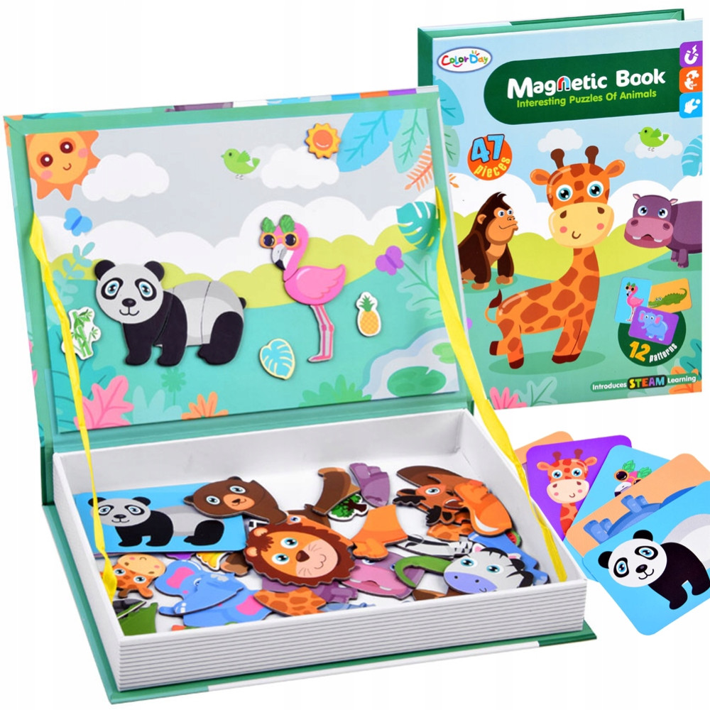 Magnetyczna układanka ZOO zwierzęta pozwoli każdemu dziecku samodzielnie stworzyć na planszy misia, zebrę, lwa itp według wzoru z karty. Ale także dziecko może stworzyć własną wersję zwierzaka takiego jak np "żyrafo zebra" lub słoń z nogami misia : ) Wiadomo iż dzieciaki mają pomysłów moc. Zestaw jest zamknięty w sztywne kartonowe pudełko imitujące książkę, wewnątrz znajduje się tablica z zielonym pejzażem, na którym dziecko może układać swoje pomysły zwierzątek.