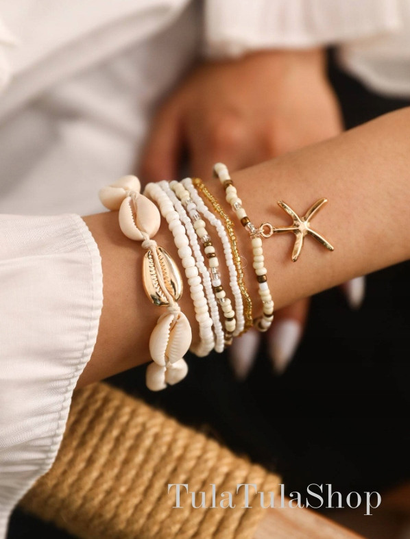 DUŻY ZESTAW: SIEDEM bransoletek w letnim stylu, w tym jedna zapinana bransoletka z muszelek kauri - hit lata!