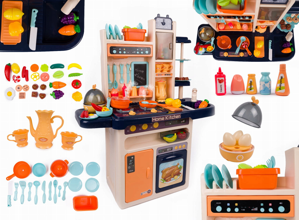 W jednym z palników zamontowany jest mechanizm, z którego wydobywa się para! Aby to nastąpiło należy wlać wodę w mały otwór palnika i umieścić na nim garnek z dziurką w dnie a następnie przekręcić pokrętło. Dodatkowo na kuchence znajduje się jajowar. Zestaw wyposażony jest ponadto w tablicę kredową, idealną do zapisywania przepisów czy dań dnia. Ciekawą cechą kuchni jest również fakt, iż po naciśnięciu przycisku słychać różne melodie, co jeszcze bardziej uatrakcyjnia zabawę. Do zestawu dołączone są akcesoria w postaci zastawy stołowej, sztućców, czajnika, patelni, owoców, warzyw i wielu innych przedmiotów.