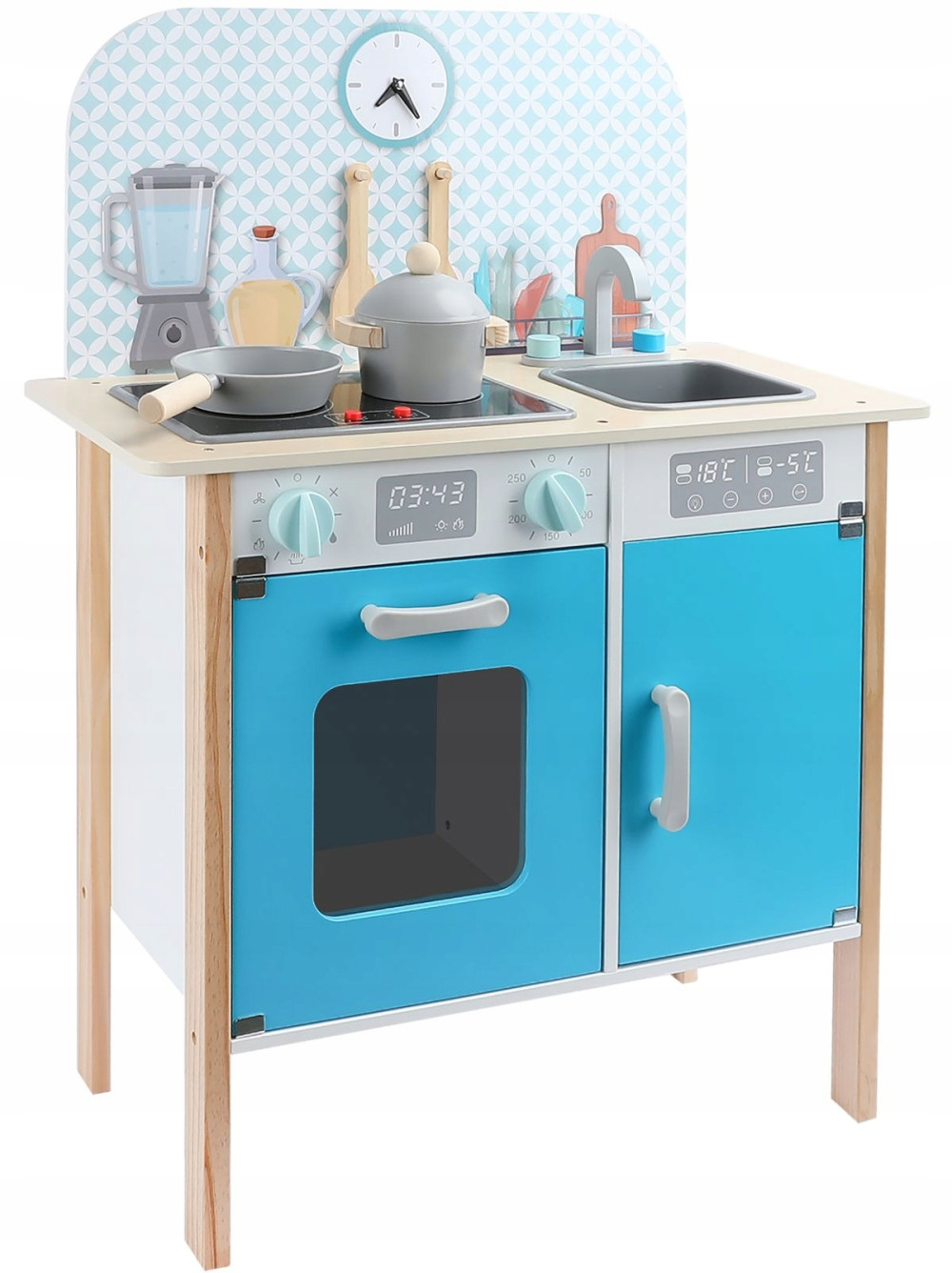 Drewniana kuchnia dla dzieci Menfi w pięknych pastelowych kolorach. Idealna do każdego dziecięcego pokoju, sali zabaw lub przedszkola. Zabawka zachęca do kreatywnej zabawy, pobudza wyobraźnię dziecka oraz stymuluje zdolności motoryczne.