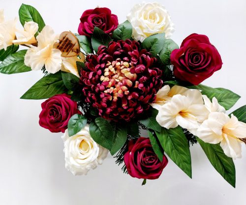 Piękna kompozycja nagrobna z sztucznych kwiatów , ciężka w donicy na pokładzie świerkowym.