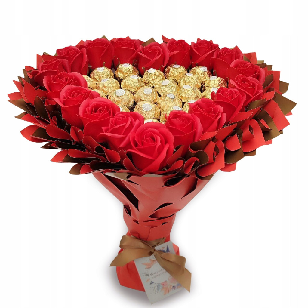 Słodki bukiet CZERWONY I ZŁOTY w kształcie serca z cukierkami Ferrero Rocher i 18 szt mydlanych róż