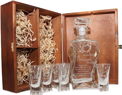 WYJĄTKOWA KARAFKA Z ZDOBIENIEM LASEROWYM WRAZ Z SZEŚCIOMA KIELISZKAMI 50 ML, UMIESZCZONE W OZDOBNEJ DREWNIANEJ SKRZYNECZCE. POJEMNOŚĆ KARAFKI TO 0,75L. IDEALNY PREZENT NA KAŻDA OKAZJĘ. PRODUKT POLSKI RĘCZNIE FORMOWANY, CZEGO EFEKTEM MOGĄ BYĆ PĘCHERZYKI POWIETRZA W STRUKTURZE SZKŁA.