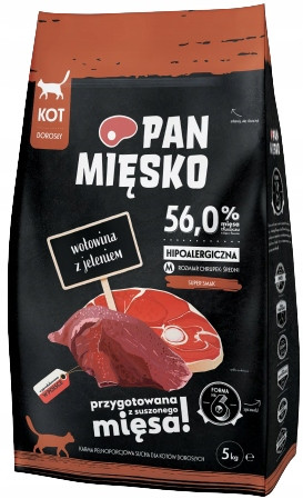 Poznaj hipoalergiczne suche karmy dla kotów Pan Mięsko. Wyróżniają je starannie wyselekcjonowane mięsa z dodatkiem soczystych polskich jabłek, zdrowych warzyw i cennych składników odżywczych, które pozytywnie wpłyną na zdrowie oraz kondycję Twojego kota. Nasze receptury zostały przygotowane przez specjalistów, po to, aby dostarczyć Twojemu czworonożnemu towarzyszowi dokładnie to, czego potrzebuje. Twój kot zasługuje na wszystko, co najlepsze.