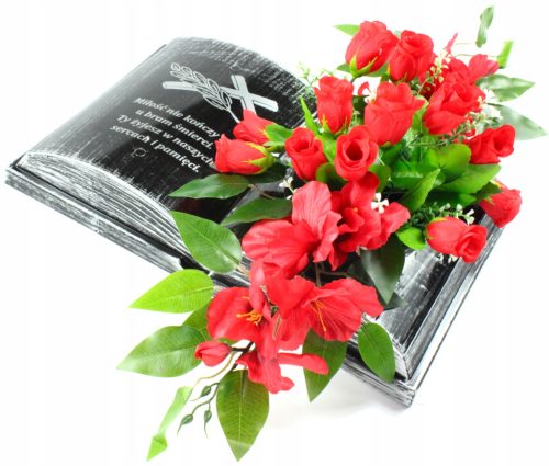 Kompozycja kwiatowa z czerwonych róż i mieczyków wykonana w plastikowej doniczce idealnie pasującej do zagłębienia w księdze. Doniczkę można wyjmować w celu zmiany dekoracji kwiatowych na różne okazje.