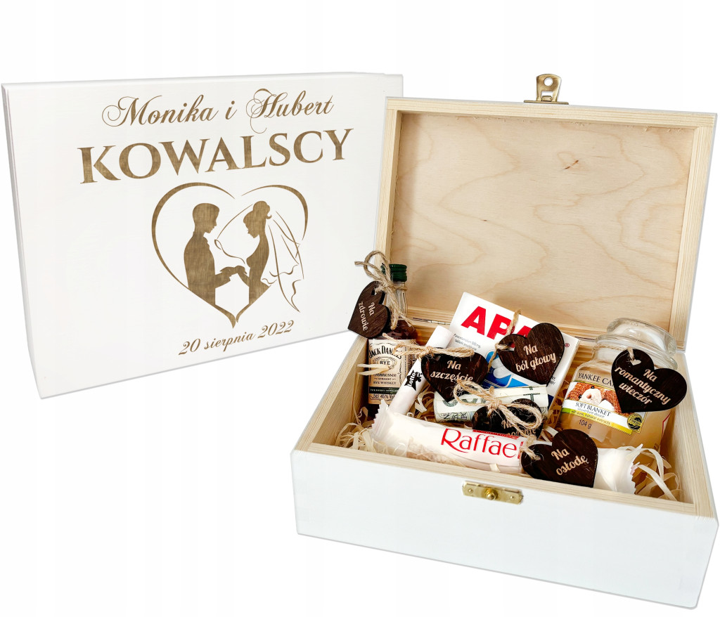 Zaskocz Państwa Młodych oryginalnym prezentem. Umieść kilka drobnych upominków razem z serduszkami w naszym białym pudełku. Całość będzie prezentować się wyjątkowo. Zachwyt i radość Pary Młodej gwarantowane!