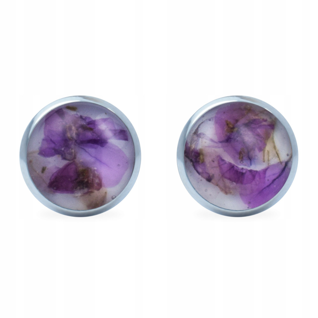Kolczyki sztyfty ze stali chirurgicznej w kształcie koła, w których zatopiono kwiaty zawciągu nadmorskiego na białym tle.