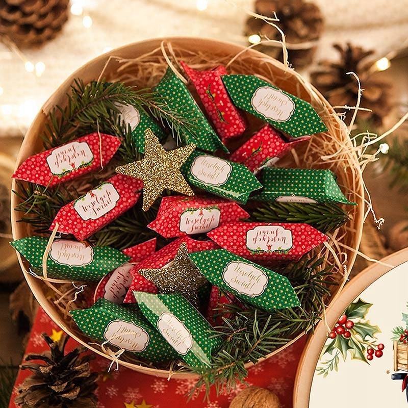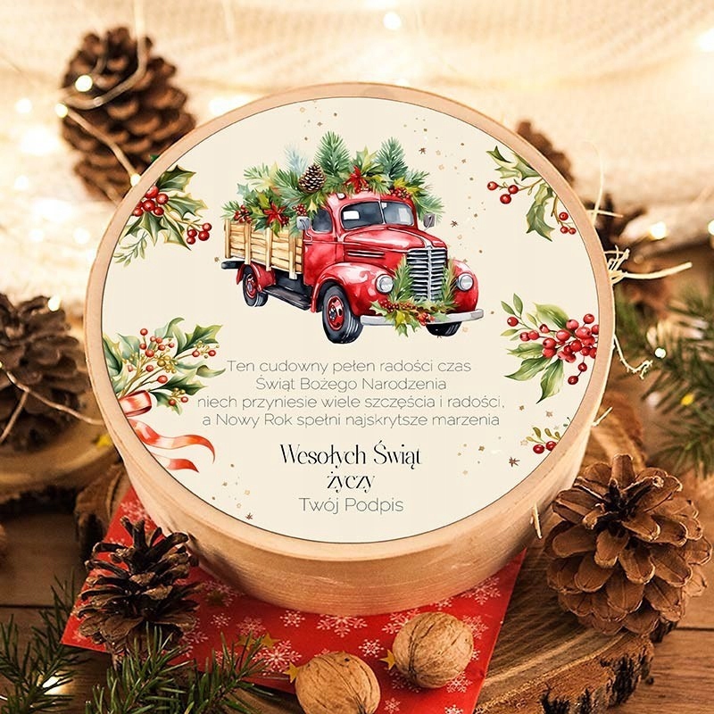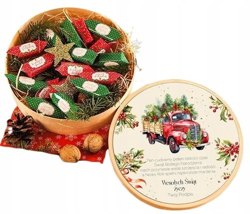 Kosz prezentowy wypełniony słodkimi polskimi krówkami owiniętymi świątecznymi papierkami. Piękny pomysł na prezent świąteczny firmowy dla pracowników i klientów biznesowych. W koszu znajduje się 18szt krówek w świątecznych odcieniach czerwieni i zieleni. Na krówkach znajdują się napisy Wesołych Świąt. Na wieczku znajduje się specjalna naklejka z życzeniami i nazwą firmy. Słodki prezent świąteczny dla najbliższych.