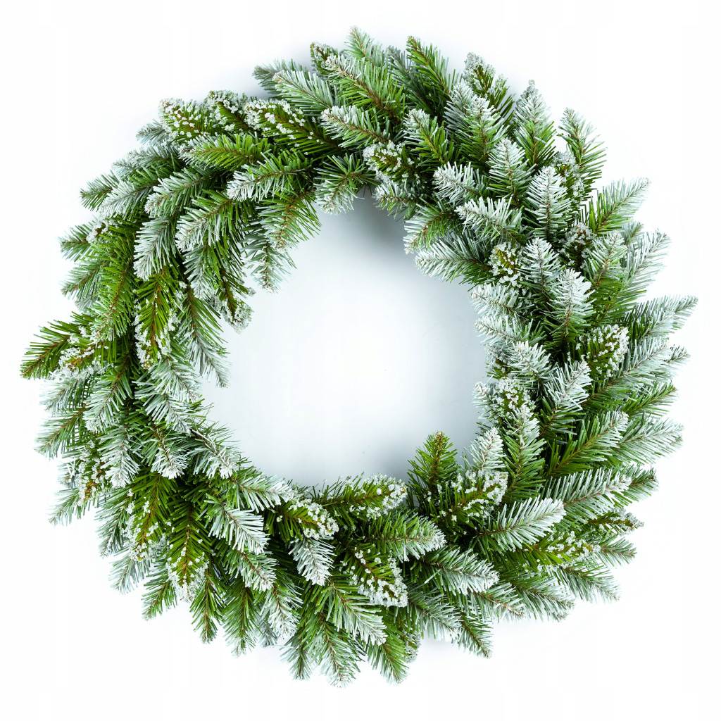 Wianek wykonany jest z gałązek choinkowych zielonych. Dodatkowo końcówki gałązek są bielone oraz zostały pokryte białymi kryształkami.