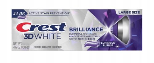 Pasta do zębów Crest 3D White Brilliance Luminous Purple Teeth Whitening wybiela zęby, usuwając o 100% więcej przebarwień powierzchniowych w 3 dni. Pasta do zębów Crest 3D White Brilliance zapewnia 24-godzinną ochronę przed plamami w połączeniu ze szczotkowaniem dwa razy dziennie. Formuła pasty do zębów Crest 3D White Brilliance zawiera fluor, który pomaga zwalczać próchnicę podczas wybielania zębów poprzez mikrooczyszczanie każdego zęba i usuwanie przebarwień powierzchniowych.