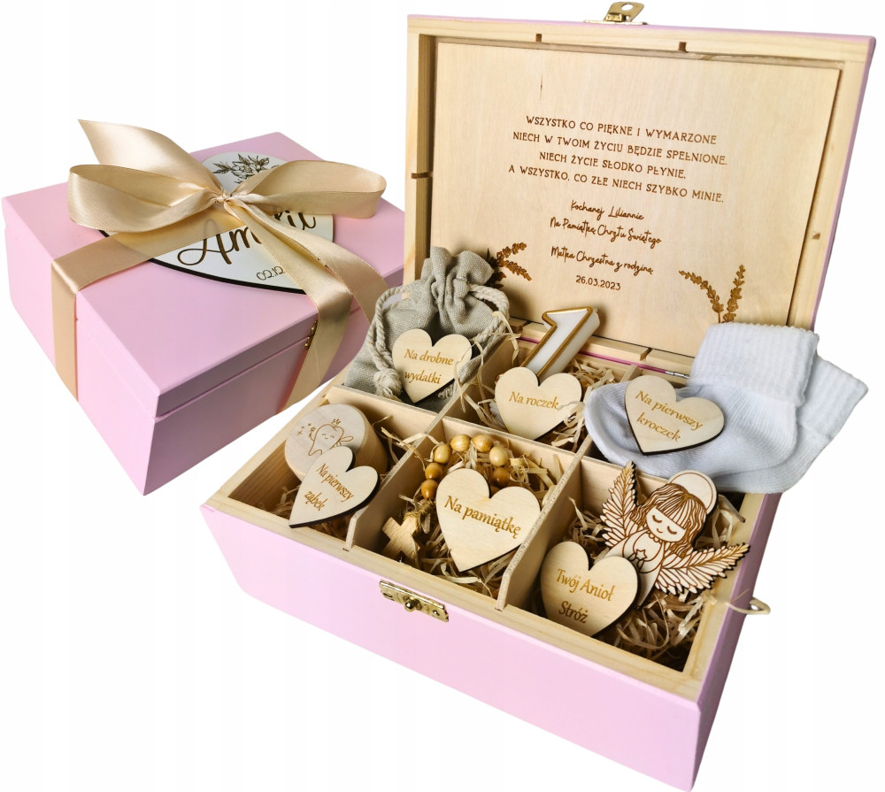 (różaniec, świeczka 1, pudełeczko na ząbek z grawerem, drewniany aniołek, woreczek lniany oraz skarpetki)