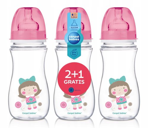 Zestaw trzech antykolkowych butelek EasyStart Toys które są lekkie, trwałe i przejrzyste.