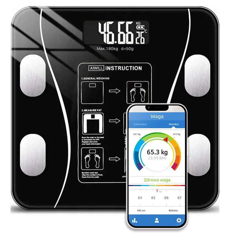 ⭐ Nowoczesna inteligentna waga elektroniczna wyposażona w wyświetlacz, który pokazuje nam nie tylko masę ciała, lecz także inne wskaźniki, m.in. zawartość wody, tłuszczu czy tkanki mięśniowej w organizmie.