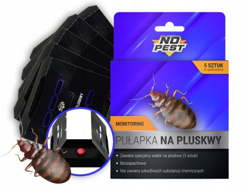Jest to pułapka lepowa, która działa na zasadzie specjalnego wabika, przyciągającego pluskwy i zwiększającego skuteczność pułapki. W opakowaniu znajdziesz aż 5 pułapek, dzięki czemu można skutecznie zwalczać większą ilość szkodników.