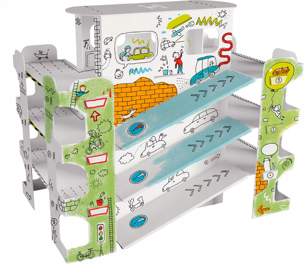 Bogate szczegóły i różnorodne elementy parkingu dają dzieciom wolną rękę w dekorowaniu i personalizowaniu ich małego miasta. Każdy parking może stać się unikatowym dziełem sztuki.