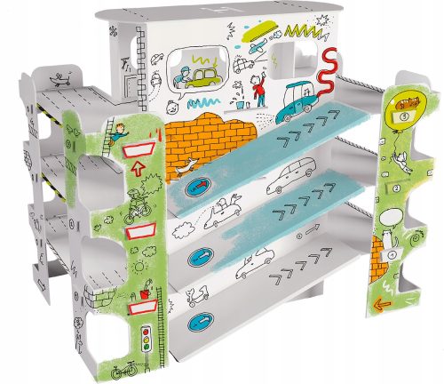 Zestaw zawiera wszystkie elementy potrzebne do stworzenia trójwymiarowego parkingu oraz instrukcję, która w prosty sposób pokazuje, jak krok po kroku złożyć i pokolorować projekt.