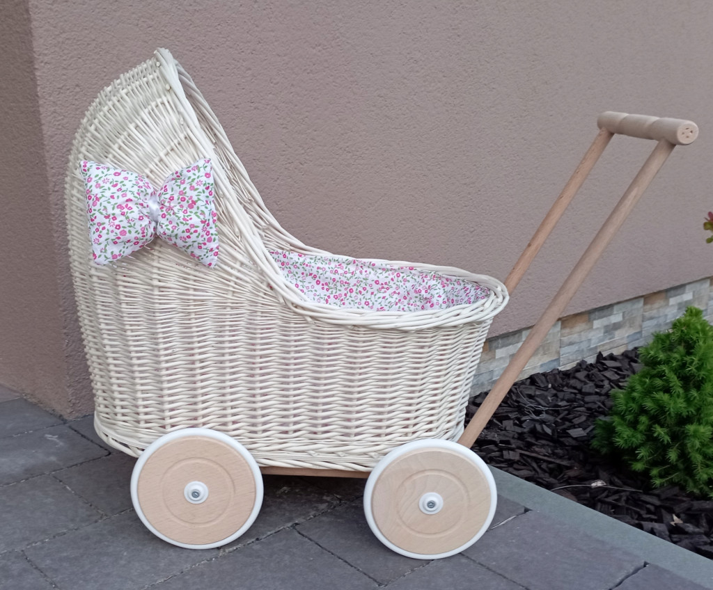 Drewniane kółka pozwalają z łatwością jeździć wózkowi, a wiklinowa rączka pozwala swobodnie pchać wózek. Piękny i modny wiklinowy wózek dla lalek. Spełnienie marzeń każdej młodej damy.