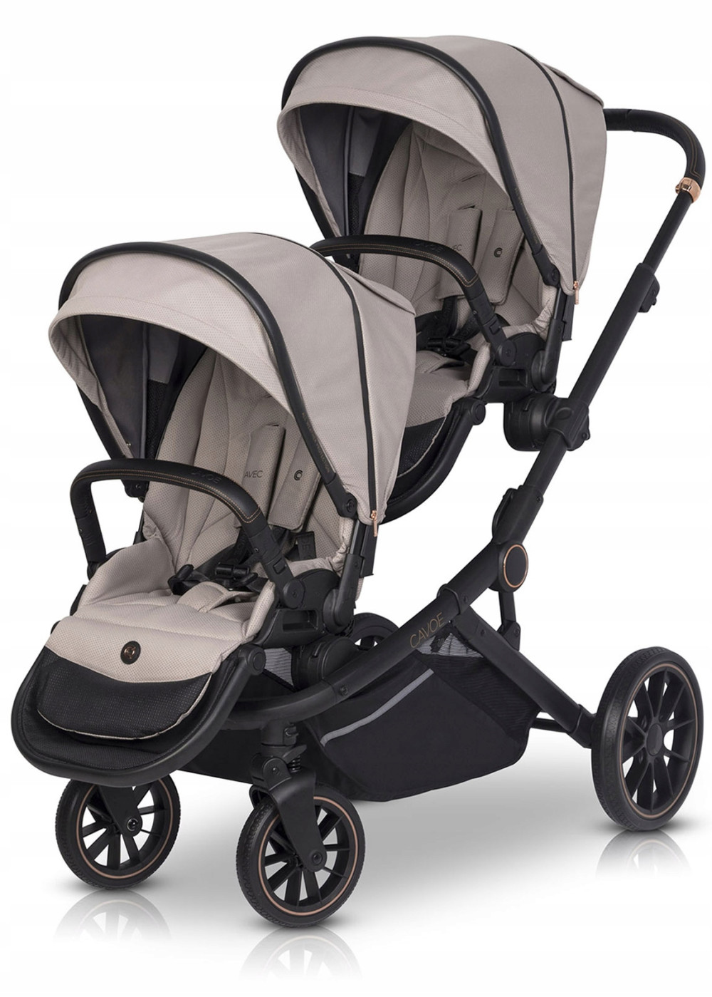 AVEC marki CAVOE jest wózkiem dla dwójki dzieci typu tandem. Oferowany jest jako wózek spacerowy z dwoma pełnowymiarowymi siedziskami z możliwością dokupienia jednej lub dwóch pełnowymiarowych gondoli. Dodatkowo marka CAVOE oferuje możliwość dokupienia uniwersalnych adapterów, za pomocą, których możesz wpiąć jeden lub dwa foteliki samochodowe CAVOE 0+ Isofix Ready lub wybrane foteliki innych znanych światowych marek w tym Maxi Cosi, Cybex i Avionaut.