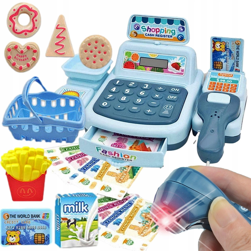 KASA FISKALNA DLA DZIECI Z DŹWIĘKIEM I ŚWIATŁEM W ZESTAWIE : KOSZ, PRODUKTY, PIENIĄDZE.
