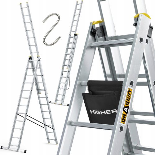 Jedną z największych zalet drabin uniwersalnych 3-elementowych PRO DRABEST jest możliwość ustawiania drabiny w pozycji wolnostojącej, czyli takiej, w której drabina nie potrzebuje ściany do podparcia. Dodatkowo, aby zwiększyć zasięg roboczy można wysuwać trzeci (najwęższy) element aż do osiągnięcia blokady bocznej, zabezpieczającej przed zbyt długim rozsuwem. Wysokość wysuwu ostatniego elementu drabiny można regulować co szczebel, dzięki czemu dopasować drabinę do wysokości w pomieszczeniu. Dzięki takim rozwiązaniom drabinę można używać nawet w miejscach, gdzie nie ma odpowiedniego podparcia do użycia drabiny w pozycji przystawnej lub też oparcie drabiny wiązałoby się z możliwością uszkodzenia ściany, rynny czy innego elementu domu. To właśnie dzięki tej możliwości drabiny 3-elementowe są najbardziej uniwersalne i popularne.