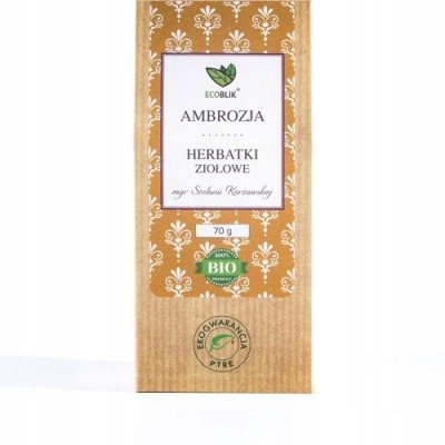 EcoBlik Herbata Ambrozja, to aromatyczna, ekologiczna herbata ziołowa. Jej starannie dobrane składniki rozgrzewają, pobudzają i mają działanie przeciwzapalne. Zalecana w przypadku wychłodzenia organizmu i zapobiegania przeziębieniom.