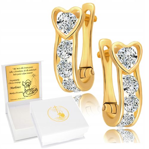 Złote piękne kolczyki wysadzane błyszczącymi cyrkoniami, zapinane na angielskie zapięcia idealne dla małych dziewczynek.