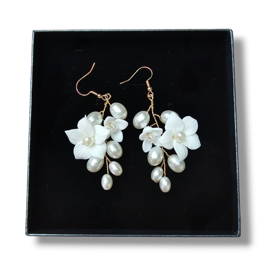 Romantyczne Kolczyki Ślubne z Białymi Kwiatami i Perłami w złotej oprawie to subtelny i elegancki dodatek, który podkreśli naturalne piękno każdej Panny Młodej.