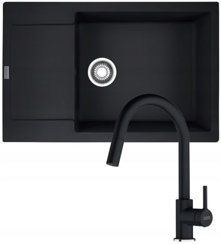 Zlewozmywak 1-komorowy z ociekaczem MRG 611-78 wykonany z Fragranitu+ o wymiarach 780 x 500 mm. W zestawie z baterią kuchenną Lina pull out. Kolor Onyx.