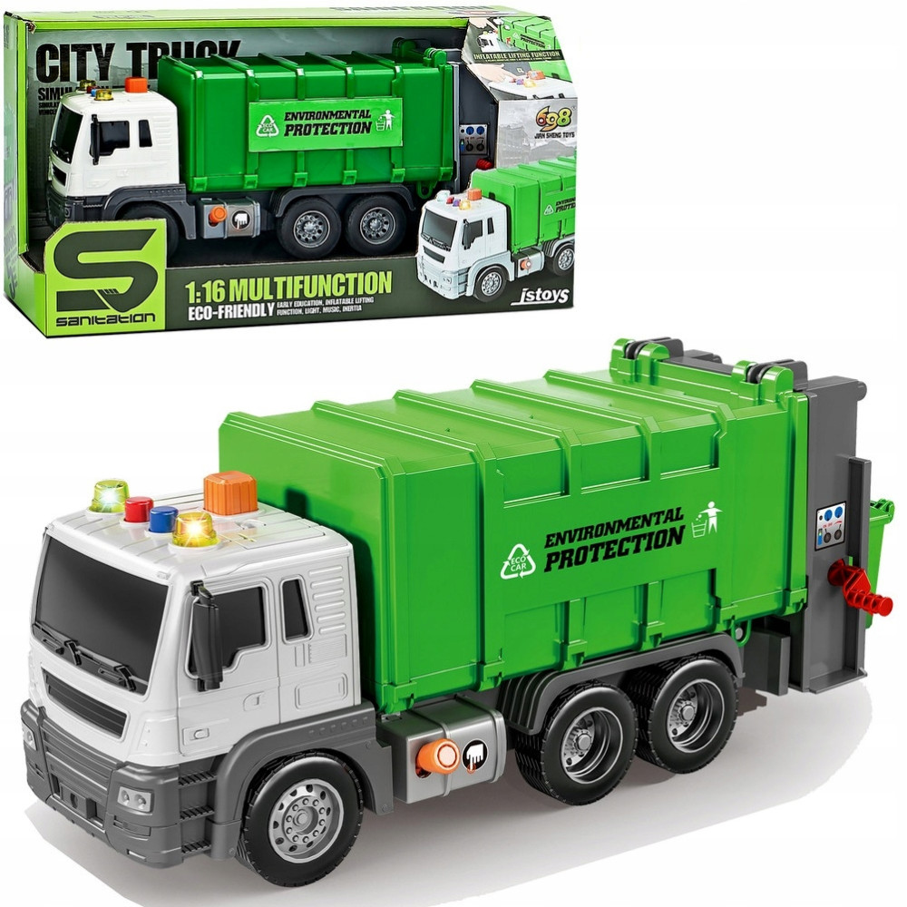 Biało-zielona śmieciarka firmy zapewni chłopcom mnóstwo frajdy oraz wiele godziny świetnej zabawy. Na kabinie zostały umieszczone przycisk którym aktywujemy światła i dźwięk silnika, cofania auta czy ruchu miejskiego - zupełnie jak w prawdziwej maszynie! Kontener pojazdu unosi się i ma otwieraną klapę umożliwiając w ten sposób opróżnienie kontenera na wysypisku śmieci.