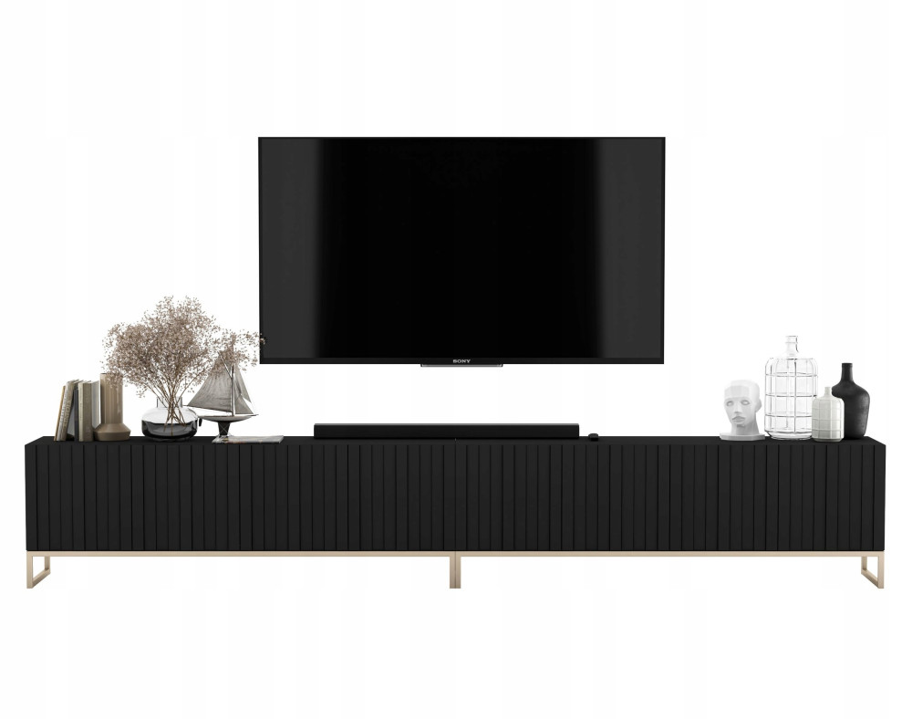 Dwie szafki RTV w stylu Glamour z kolekcji ELPIS, idealnie nadają się pod telewizor oraz dodadzą każdemu wnętrzu niepowtarzalnej elegancji. Umieszczone obok siebie tworzą jeden długi, bardzo ładnie prezentujący się mebel. Posiadają cztery funkcjonalne, zamykane komory z podziałem na dwa poziomy. System "push to open" do otwierania drzwiczek zapewnia estetyczny wygląd szafki, ze względu na brak widocznych uchwytów. Występuje również możliwość regulacji wysokości półek, która pozwala na dostosowanie przestrzeni do indywidualnych potrzeb. Meble z tej kolekcji wyróżniają się na tle innych szafek RTV ryflowanymi frontami, które podkreślają nowoczesny i elegancki wygląd szafek.