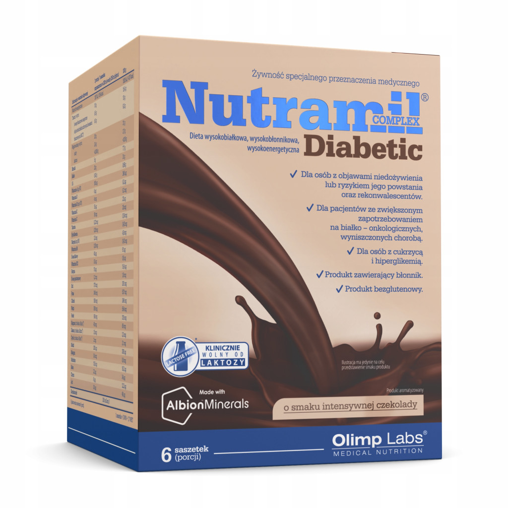 Preparat stanowi kompozycję niezbędnych składników pokarmowych – białek, węglowodanów, tłuszczów, błonnika, witamin, mikro- i makroelementów (w tym minerałów w postaci wysoko przyswajalnych chelatów aminokwasowych Albion™). Odpowiedni dla diabetyków**. Stanowi uzupełnienie codziennej diety. Zawiera dwa źródła wysokowartościowego białka o zróżnicowanej kinetyce wchłaniania – koncentrat białka serwatki oraz kazeinian wapnia. Źródłem węglowodanów w produkcie są maltodekstryny, które podobnie jak białko wykazują zróżnicowaną szybkość absorpcji. Źródłem tłuszczów są oleje roślinne dostarczające długołańcuchowych triglicerydów (LCT) i niezbędnych kwasów tłuszczowych oraz triglicerydów o średniej długości łańcucha (MCT), stanowiących łatwo dostępne źródło energii dla osób, dla których jest to istotne tj. niedożywionych czy wyniszczonych. Do trawienia triglicerydów o średniej długości łańcucha (MCT) nie jest konieczna lipaza i żółć, co ma istotne znaczenie m.in. u osób z funkcjonalnymi zaburzeniami trzustki, przebiegającymi z upośledzeniem wchłaniania tłuszczów. Produkt bezglutenowy. Klinicznie wolny od laktozy*. Wśród osób, którym lekarz zaleci stosowanie produktu, mogą znajdować się osoby wykazujące nietolerancję laktozy. W takich przypadkach znaczna zawartość laktozy w produkcie mogłaby uniemożliwić lub ograniczyć jego stosowanie, co byłoby sprzeczne ze wskazaniami lekarza. Z tego względu Nutramil complex Diabetic jest *klinicznie wolny od laktozy, tj. jej ilość nie przekracza 0,02 g/ 100 kcal w całodziennej diecie, co jest zgodne z opinią Panelu Naukowego EFSA ds. żywności dietetycznej, żywienia i alergii (EFSA Journal 2010;8(9):1777). **W przypadku użycia jako uzupełnienie diety pod względem pokrycia zapotrzebowania energetycznego przez białko i tłuszcz, jednoczesnej zawartości węglowodanów złożonych, białka i tłuszczu w celu uzyskania niskiego indeksu glikemicznego, ograniczenia zawartości cukrów prostych, ograniczenia tłuszczów pochodzenia zwierzęcego na korzyść tłuszczów roślinnych, zawartości wszystkich istotnych witamin i minerałów, a także błonnika (DIETA W CUKRZYCY TYPU 2, Szpital Uniwersytecki w Krakowie). Dodatkowo należy stosować produkty spożywcze nieprzetworzone, ograniczyć spożycie soli kuchennej, a posiłki należy spożywać w małej objętości, regularnie 4-5 razy dziennie.