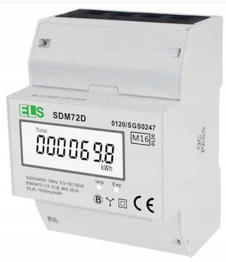 Model SDM72D z podświetlanym wyświetlaczem LCD służy do monitorowania zużycia energii elektrycznej prądu przemiennego sieci trójfazowej w układzie bezpośrednim w zastosowaniach komercyjnych i przemysłowych. Mierzy i wyświetla całkowity pomiar energii czynnej [kWh]. Licznik również wyposażony jest w dodatkowe wyjście impulsowe, dzięki czemu można podłączyć urządzenie zliczające lub zewnętrzne źródło zasilania.