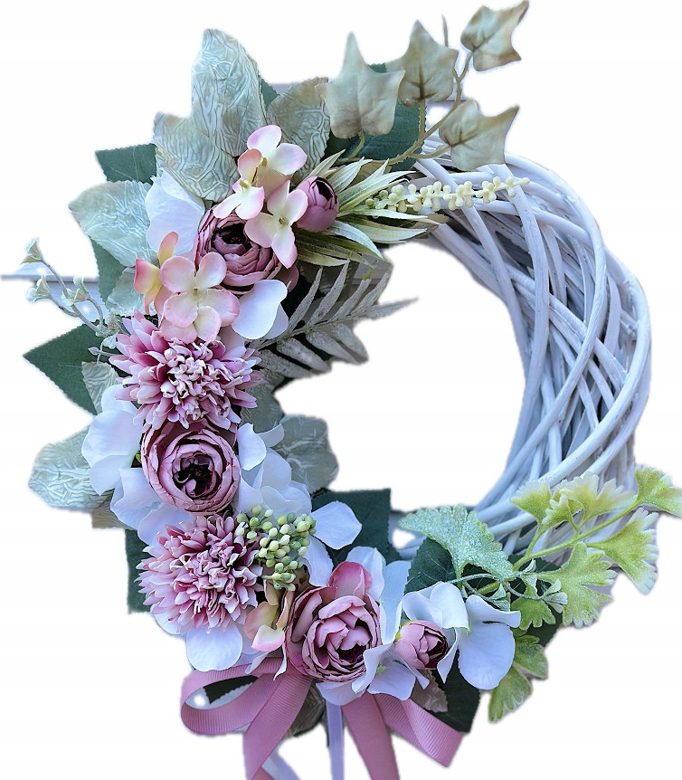 Wianek wiosenny, ozdobiony sztucznymi kwiatami pełników, hortensji oraz różnorodnymi dodatkami, liśćmi i kokardką.