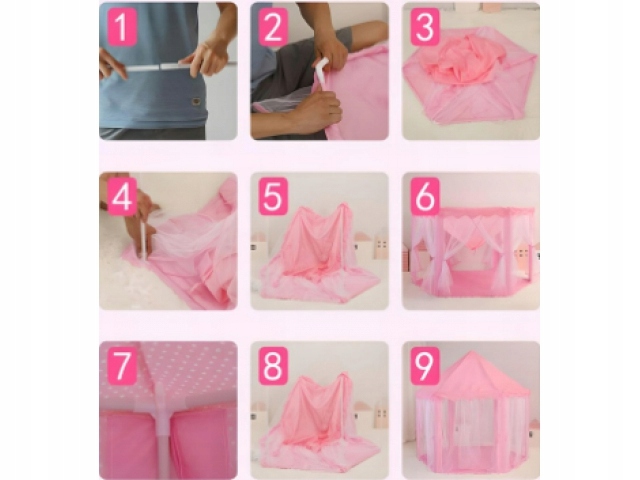 Namiot dla dzieci to wspaniały sposób na kreatywną i fantazyjną zabawę w domu, jak i poza nim. Pobudza wyobraźnię i pozwala na radosne spędzenie czasu samemu lub w większym gronie, bez ograniczenia wiekowego. Piękny namiot, w postaci rozkładanego sześciokątnego pałacu, który zadowoli każdą małą księżniczkę. Śliczny namiot z baldachimem znajdzie swoje miejsce zarówno w pokoiku, jak i tarasie czy w ogrodzie.Namiot jest bardzo duży, dlatego jednocześnie w nim może przebywać kilkoro dzieci.