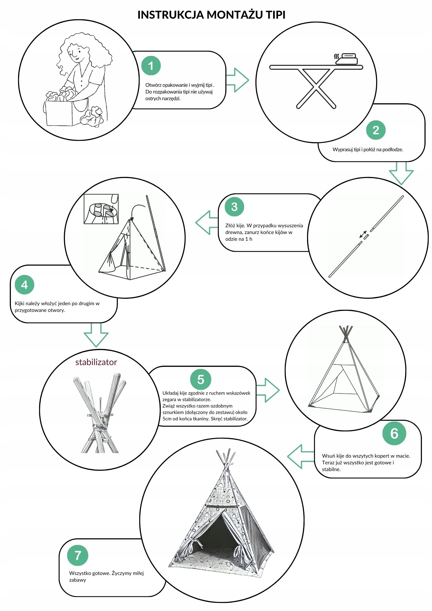 Wszystkie materiały użyte do produkcji tipi są nietoksyczne i bezpieczne dla dzieci – posiadają niezbędne certyfikaty CE, które na życzenie Kupującego wysyłamy drogą mailową.